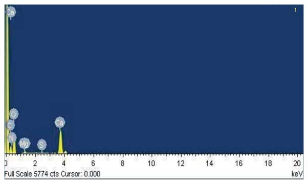 活性炭的表面化學(xué)成分是通過(guò)使用能量色散X射線(EDX)光譜確定的。得到的光譜見圖2,C、N、0、Mg、Ca的百分比分別為7.64%、14.53%、35.31%、0.70%、41.80%。FTIR結(jié)果支持C、N和O的存在,該結(jié)果表明存在羰基和胺基團(tuán)。除此之外,高百分比的Ca表明主要是鈣的性質(zhì)。此外,光譜中出現(xiàn)Mg表明Mg化合物與碳和氧強(qiáng)烈結(jié)合。因此,無(wú)論是用熱蒸餾水還是冷蒸餾水,都不容易通過(guò)洗滌去除。