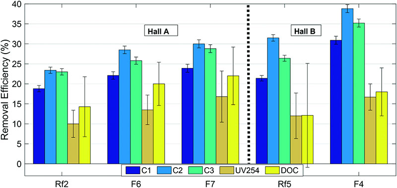 圖2:改造后的(F6,F(xiàn)7和F4)和參考(Rf2和Rf5)過濾器中活性炭對有機物級分的去除效率。誤差棒表示通過誤差傳播計算的標準誤差(N=4)。