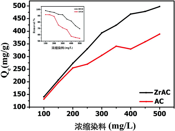 吸附等溫線 已經進行了初步的批處理實驗,以研究新制備的載鋯活性炭的性能并確定其在廢水處理中的可行性。使用活性炭和載鋯活性炭的染料吸附如圖3所示。該圖顯示,隨著濃度從100 mg L -1增加到500 mg L -1,載鋯活性炭對活性藍19染料的去除效率更高。同樣,載鋯活性炭的吸附容量也顯示出比活性炭大吸附容量。載鋯活性炭的去除效率和吸附能力的提高主要歸因于較高的氧化功能,該功能很容易從溶液中吸收染料分子。