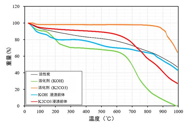 圖1:用每種化學品浸漬的化學試劑和碳前體的熱重分析結果。