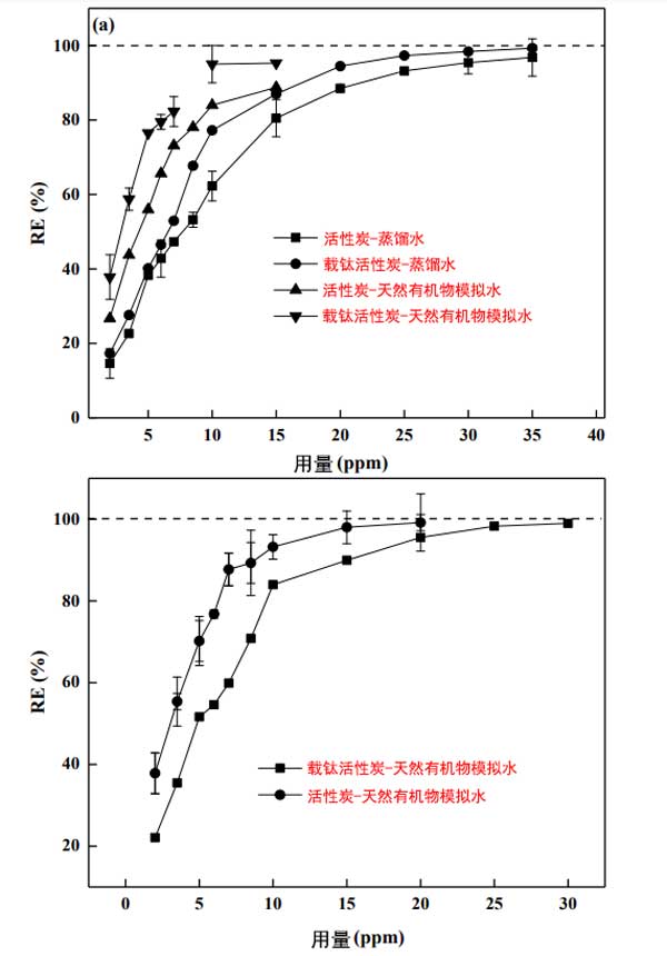天然有機物的主要成分是腐植酸和單寧酸,因為它們普遍存在于各種天然水中。圖3顯示了從蒸餾水和天然有機物水中消除2-甲基異冰片的情況,這取決于光降解前后催化劑的用量。如圖3a所示,發(fā)現(xiàn)兩種催化劑在天然有機物水中的去除更接近。然而,腐植酸和單寧酸的存在導致活性炭和載鈦活性炭對2-甲基異冰片的吸附能力顯著降低。此外,為了達到氣味閾值濃度值,兩種催化劑在低天然有機物濃度的水中所需的劑量比在蒸餾水中增加了大約一倍。這種現(xiàn)象表明天然有機物和2-甲基異冰片之間對于兩種催化劑的活性位點存在競爭關系。同時,值得注意的是,當微生物分子接近模型污染物時,競爭吸附最強。然而,在光降解后,載鈦活性炭對2-甲基異冰片的去除效率顯著提高(圖3b)。