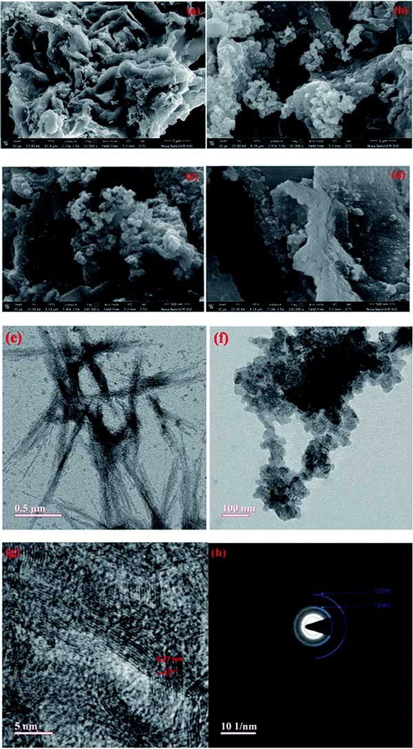 圖2:(a-d)FESEM圖像,(e,f)TEM圖像,(g)HRTEM圖像和(h)載鉬活性炭的SAED圖案。