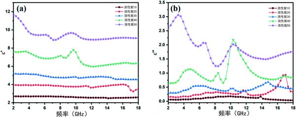 圖3:(a)載鉬活性炭-石蠟復(fù)合材料的相對(duì)復(fù)介電常數(shù)的實(shí)部和虛部,填充量從10%到50%不等。