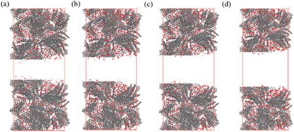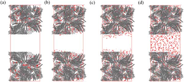 活性炭由微孔和介孔組成,介孔在一定程度上影響吸附特性。因此,研究芳烴在具有分級孔的活性炭上的吸附特性,以明確介孔對下一節(jié)吸附特性的影響。在這些模擬中,選擇了密度為0.8g/cm3的微孔活性炭,不同樣品的中孔尺寸分別選擇為2.0、2.5、3.0和4.0nm。具有不同層次孔隙的活性炭。分層孔隙活性炭模型構建為密度在0.6-0.7g/cm3的合理范圍內。圖3展示了苯分子在p=10kPa下具有不同中尺度孔徑的活性炭上的吸附位點分布。這表明即使在p=10kPa時,苯的吸附也僅發(fā)生在介孔表面,而不會填充介孔的空隙空間。圖4說明了對二甲苯在具有3.0nm孔的活性炭上從低壓到高壓的吸附位點的變化。從圖4(a)-(d)可以看出,只有微量的對二甲苯分子被吸附到微孔上,當壓力為1.25kPa時,微孔逐漸被填滿,中孔壁上出現(xiàn)吸附位點。當壓力增加到3.75kPa時,吸附位點增加,介孔中開始出現(xiàn)多層吸附,最終介孔充滿對二甲苯,此時壓力可達6.25kPa。
