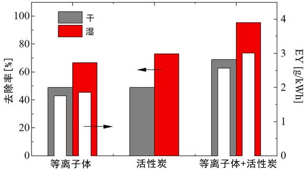 圖2:在干燥和潮濕條件下,單獨(dú)使用等離子體、活性炭和使用活性炭的等離子體對(duì)甲乙酮的去除(彩色條)和能量產(chǎn)率(白色條)。