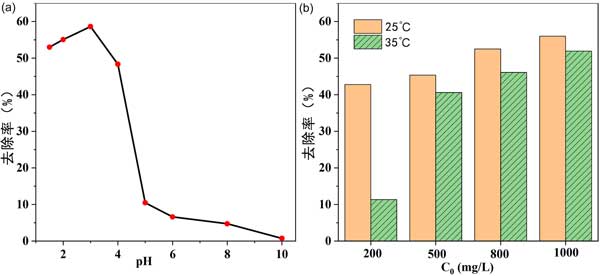溫度也影響吸附過程?疾炝瞬煌瑴囟认虏煌瑵舛却姿崛芤旱奈竭^程,其他條件不變。結(jié)果如圖2(b)所示。對于不同濃度的乙酸稀釋劑,25℃時的吸附去除率高于35℃時的吸附去除率,表明吸附過程是放熱的。因此進(jìn)一步的實(shí)驗(yàn)僅在25℃下進(jìn)行。對于工業(yè)應(yīng)用,室溫條件是可行的,無需提供額外的熱源。
