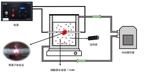 研究中用于制備銀納米顆粒沉淀活性炭的液相等離子體裝置在圖1顯示。使用左上角的電源為安裝在石英反應(yīng)器中心的鎢電極供電。此時(shí),脈沖寬度為5μs,施加電壓為250V,頻率在30kHz的運(yùn)行條件下運(yùn)行。液相等離子體反應(yīng)器采用雙管式制造,為防止等離子體產(chǎn)生的熱量導(dǎo)致溫度升高,在反應(yīng)器外通道循環(huán)冷卻水,使反應(yīng)溶液的溫度保持恒定在15℃。