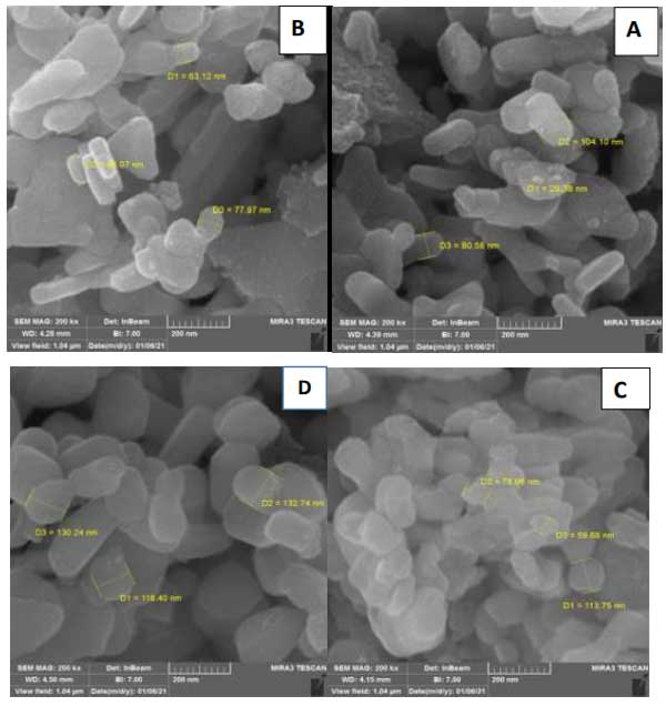 未活化的活性炭與物理活化的活性炭復(fù)合材料的合成使用水熱法制備了。根據(jù)該方法,金屬化氧化鐵銅納米粒子懸浮在30mL燒杯中,直接加入活性炭懸浮液,超聲處理30分鐘。然后將這兩種懸浮液在一個(gè)燒瓶中混合,在80℃下連續(xù)攪拌,直到溶劑完全蒸發(fā)。此時(shí),收集所得固體并在100℃下干燥12小時(shí)獲得活性炭復(fù)合材料。利用掃描電鏡對(duì)合成的這幾種活性炭材料的表面形貌進(jìn)行了研究。純氧化鐵銅納米粒子的表面形態(tài)如圖1A所示,它顯示了中等均勻的球形顆粒,粒徑約為31nm;钚蕴繌(fù)合材料的圖像如圖1C所示,該圖像顯示了較小的均勻性,粒徑相對(duì)較大,并且存在顆粒團(tuán)聚。這很可能是由于復(fù)合材料中存在活化后的活性炭,這可以增強(qiáng)表面協(xié)同效應(yīng),促使顆粒尺寸增加,因?yàn)樵谶@些條件下晶體生長(zhǎng)。復(fù)合材料氮鐵銅的圖像如圖1D所示,從該圖像可以看出,存在相對(duì)均勻的分布,球形顆粒幾乎與氧化鐵銅相似,但氧化鐵銅氮的粒徑相對(duì)大于氧化鐵銅。這可能是由于摻雜氮物種后晶體生長(zhǎng)所致。