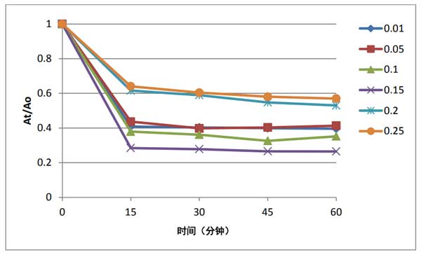 為了研究所用活性炭用量對(duì)其模擬水溶液中染料去除效率的影響,使用不同用量的活性炭復(fù)合材料進(jìn)行了一系列實(shí)驗(yàn)。這些質(zhì)量分別為0.01、0.05和0.10、0.15、0.20和0.25g。這些實(shí)驗(yàn)是在相同條件下進(jìn)行的,所有運(yùn)行的吸附時(shí)間為1小時(shí)。通過(guò)在468nm處測(cè)量吸光度來(lái)記錄上清液的吸光度來(lái)跟蹤吸附能力。從獲得的結(jié)果,發(fā)現(xiàn)用量為0.15g。如圖3所示,所用活性炭復(fù)合材料的染料去除效果好,如圖3所示。增加催化劑用量。這可能與隨著所用材料的質(zhì)量增加而增加可用吸附位點(diǎn)有關(guān)。這將導(dǎo)致在可用的吸附位點(diǎn)上吸附更多的染料分子。在使用大于0.15克的用量時(shí),染料去除效率會(huì)降低,這可以解釋為在使用高劑量吸附劑時(shí)會(huì)增加溶液的密度和材料顆粒的聚集。