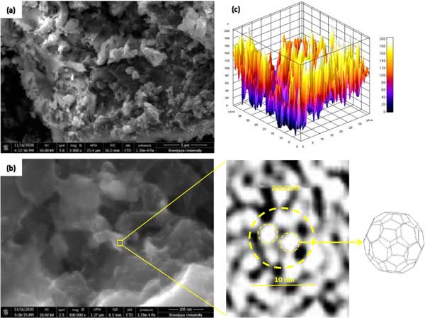 圖1:(a)放大5000倍的活性炭表面形態(tài)(b)活性炭內的富勒烯簇(c)表面電荷。