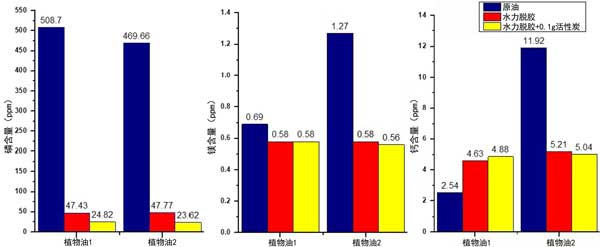 磷含量在兩個兩種植物油中主要由以所示的處理(水重量2%+活性炭0.1克)后減少圖2。植物油1的磷含量降低了大約95.22%,而植物油2的磷含量降低了大約相同的值(94.98%)。油液經(jīng)水脫膠后Mg、Ca含量略有下降,而Ca處理后略有升高。這一結果可能是由于在處理過程中活性炭中存在一些Ca解離回油相。活性炭對磷含量的大量降低是由于NaOH改性的活性炭具有極性、帶正電荷的表面。由于存在芳環(huán)簇和固有缺陷,它還具有磁力。在脫膠過程中將活性炭添加到植物油和水中時,活性炭的芳環(huán)簇中的離域電子產(chǎn)生磁矩,強烈誘導磷脂磷酸頭部周圍的順磁性氧。同時,活性炭的極性/親水性也允許與極性水分子相互作用。水分子也被磁場激活,從而發(fā)生氫自旋從旁水到鄰水的重新定向,從而降低水的抗磁性;钚蕴空T導的這種磁場會導致表面張力降低,削弱水分子的分子內能。結果,更多的水分子被分解成H+離子和OH-離子,促進更多水解反應。這些現(xiàn)象與其他力量相結合:熱能和離心也會引發(fā)磷脂分子內的鍵斷裂,導致磷酸頭部基團從磷脂分子上分離(脫磷脂)。