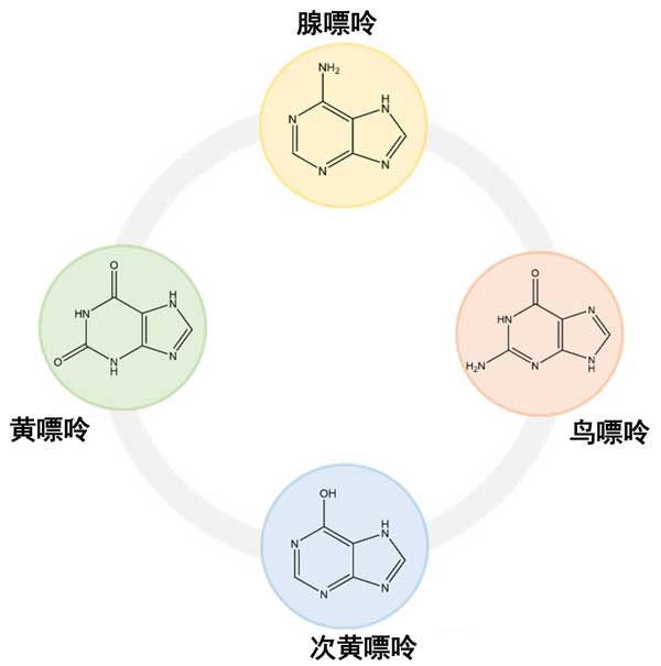 嘌呤化合物在所有生物體中都至關(guān)重要。嘌呤,其是指取代的嘌呤和各自的互變異構(gòu)體,如示于通過嘧啶的融合和咪唑環(huán)形成的,雜環(huán)芳香化合物(圖1)。這類化合物包括堿基、核苷和核苷酸,一些例子是腺嘌呤、鳥嘌呤、次黃嘌呤和黃嘌呤(圖2)在哺乳動物中,嘌呤更常見地表達為核酸,例如核糖核酸和脫氧核糖核酸(分別為RNA和DNA),它們包含兩個嘌呤堿基腺嘌呤和鳥嘌呤,以及幾種單分子核苷酸,如ATP、ADP、單磷酸腺苷(AMP)和環(huán)磷酸腺苷(cAMP),以及在較小程度上,鳥苷三磷酸(GTP)和環(huán)磷酸鳥苷(cGMP)。
