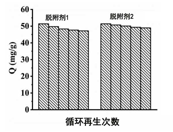 改性活性炭的回收利用在實(shí)際應(yīng)用中具有重要意義,因?yàn)樗梢越档蜕a(chǎn)成本,節(jié)省時(shí)間。為了研究改性活性炭回收的重要指標(biāo),我們考慮了吸附劑活性基團(tuán)的性質(zhì)。在本研究中,對(duì)兩種改性后的活性炭進(jìn)行再生。將0.1g改性活性炭吸附的鎘離子分別放入兩種溶液中,在恒溫震蕩器中放置6小時(shí)進(jìn)行解吸再生。然后重復(fù)吸附和解吸實(shí)驗(yàn)5次,樣品溶液再吸附鎘離子的溶解度為0.1g/L。圖4表明0.1mol/L聚乙烯多胺溶液是改性活性炭的合適再生劑,因?yàn)榫垡蚁┒喟肪哂泻軓?qiáng)的絡(luò)合能力,可以在不破壞吸附劑原有結(jié)構(gòu)的情況下解吸金屬離子。這些結(jié)果證明活性炭不僅具有較高的去除率,而且具有良好的回收性能,具有良好的應(yīng)用前景。