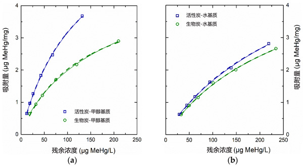 為了在活性炭和生物炭材料的評估過程中應用非,F(xiàn)實的條件,關(guān)于甲基汞的去除,在pH值為7時應用類似天然的水以獲得吸附等溫線。此外,初始甲基汞濃度為500μg Hg/L,試圖滿足兩個方面,即接近RL的殘余濃度和應用等溫模型的有效擬合。關(guān)于等溫模型,為普遍吸附方程,考慮液相吸附。等溫數(shù)據(jù)和相應方程的擬合如圖1所示。所有改性材料都顯示出兩種模型的高度相關(guān)性,這歸因于相當?shù)偷奈截摵,因此,它們代表了單層覆蓋。另一方面,當應用初始未改性材料時,在相同的實驗條件下,等溫模型和高殘留甲基汞濃度均呈現(xiàn)零相關(guān)性。