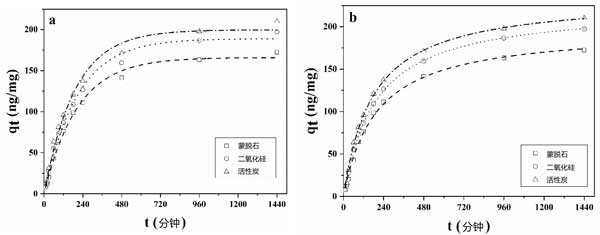 圖2:(a)黃曲霉毒素在活性炭和其它吸附劑上吸附的擬一級(jí)動(dòng)力學(xué)模型擬合曲線和(b)擬二級(jí)動(dòng)力學(xué)模型擬合曲線。