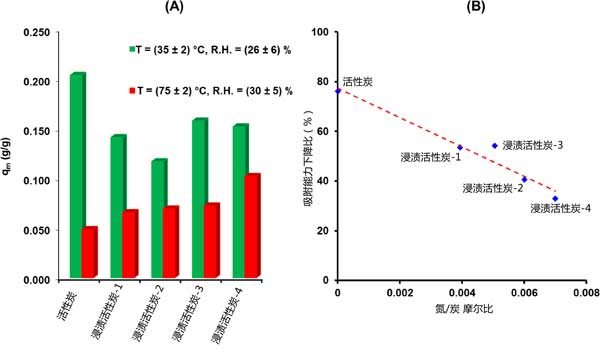 甲基碘吸附容量的降低程度取決于活性炭的性質(zhì)(圖2(A))。正如預(yù)期的那樣,對于未浸漬的吸附劑觀察到有害的影響,其中僅已知不涉及CH3I吸附的特定相互作用。更準確地說,當從活性炭材料的第一組條件轉(zhuǎn)移到第二組條件時,概述了大約76%的吸附容量下降(圖2)。在這方面,為了克服與水蒸氣和溫度相關(guān)的影響,三乙二胺浸漬是必不可少的。最近,由于水對三乙二胺分子具有很強的親和力,因此三乙二胺浸漬可以通過釋放載體的活性位點來提高活性炭的保留性能]。此外,與其他機制(尤其是物理吸附)相比,化學(xué)吸附甲基碘的比例隨著溫度升高而增加。然后,三乙二胺與甲基碘的化學(xué)反應(yīng)性將在較高溫度下增強。得到的結(jié)果(圖2)表明隨著氮含量的增加,在“惡劣條件”下的保留性能逐漸提高。因此,以浸漬中含量最高為特征的活性炭-4吸附劑的吸附容量僅降低了33%。更準確地說,可以推斷出所有考慮的吸附劑的減少幅度和摩爾比之間的準線性關(guān)系(圖2B)。根據(jù)這種關(guān)系,似乎需要浸漬,以確保在更嚴格的條件下更牢固地固定甲基碘。