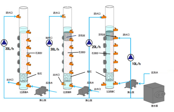試驗裝置如圖1所示,主體結(jié)構(gòu)采用有機玻璃制成,內(nèi)徑70mm,高度2000mm。過濾器包括進水管、出水管、反沖洗水管、支撐層和過濾介質(zhì)層。200毫米高的支撐層由礫石制成。粒徑為0.5-1mm,和分別為1-2mm,過濾層的填料為石英砂和椰殼活性炭。過濾器A的填料層為1000mm石英砂。過濾器B、C的填料層均為上層200mm椰殼活性炭和下層800mm石英砂。根據(jù)水廠的設(shè)計規(guī)范,過濾器的過濾速度為8m/h,進水流量為30L/h。過濾器A和B為單點進水,過濾器C為兩點進水,兩個進水點分別位于過濾器頂部和20cm深度處;第一進水點流量為20L/h,第二進水點流量為10L/h。過濾器A和B是過濾器C的空白對照。過濾器每24小時反洗一次。