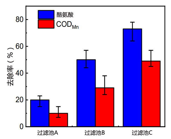 活性炭濾池出水二氯乙腈前體酪氨酸和CODMn的平均去除率如圖2所示。實驗過程中,三個活性炭過濾器出水酪氨酸濃度依次下降:過濾器C(73%)>過濾器B(50%)>過濾器A(20%)(p<0.05)。生物濾池出水的酪氨酸濃度低于進水。誰記錄了飲用水處理廠生物過濾后出水中DON濃度的增加,表明DON總體出水濃度的變化并不代表個體的變化,而是過濾器中不同個體的變化規(guī)律也不同。平均出水CODMn去除率的變化趨勢與平均出水酪氨酸去除率一致。CODMn去除率可以反映生物濾池中有機物的去除情況。酪氨酸是一種有機物,其分子結(jié)構(gòu)中含有還原性酚羥基和氨基,可被高錳酸鉀氧化。因此,CODMn去除率也可以作為酪氨酸去除的依據(jù)。