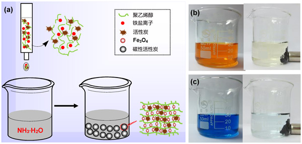 圖1:(a)磁性聚乙烯醇/活性炭復(fù)合凝膠制備示意圖。(b)亞甲基藍和(c)甲基橙的水溶液在(左)和(右)被活性炭磁性吸附劑吸附之前和之后(右)的照片。
