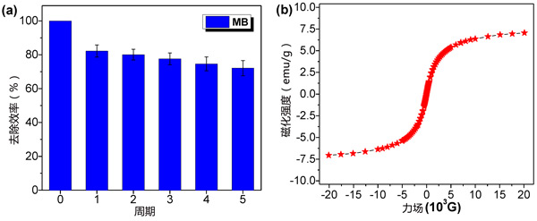 首先,研究了活性炭含量對磁性吸附劑吸附能力的影響。為了比較,活性炭的吸附容量也在相同條件下確定。在較高的初始染料濃度(5.0mM)下,磁性活性炭對MB和MO的飽和吸附能力明顯增加,隨著活性炭含量的增加。但是對于實際的吸附應(yīng)用,非常需要具有良好可重復(fù)使用性的吸附劑。我們通過使用乙醇作為洗脫劑來評估吸附MB的磁性活性炭的可重復(fù)使用性。如圖3a所示,解吸的磁性活性炭的去除效率隨著重復(fù)使用次數(shù)的增加而降低。與原來的去除效率相比,經(jīng)過5個解吸-吸附循環(huán)后,去除效率保持在72.1%左右。盡管如此,再生的活性炭的吸附能力仍然比較高,高于傳統(tǒng)的磁性吸附劑。此外,即使經(jīng)過5次再生吸附循環(huán)后,磁性活性炭仍表現(xiàn)出與新制備的相似的飽和磁化強度值(圖3b),表明這次的新型吸附劑具有良好的結(jié)構(gòu)穩(wěn)定性。