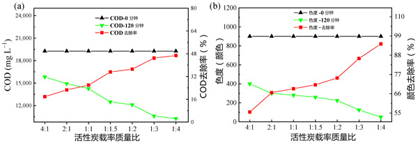 圖1:活性炭載鋁質(zhì)量比對(duì)(a)COD和(b)2小時(shí)色度去除的影響。