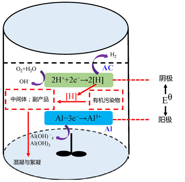 根據(jù)實(shí)際工況,提出了一種可行的活性炭載鋁微電解工藝分解水生環(huán)境中有機(jī)污染物的反應(yīng)機(jī)理(圖2)。由于其高吸附容量和電導(dǎo)率,活性炭被用作陰極保護(hù)。在陽(yáng)極(鋁廢料),由鋁提供的電子通過微型原電池轉(zhuǎn)移到陰極(活性炭),吸附在陰極表面的有機(jī)污染物受到這些釋放的電子的攻擊。水電離產(chǎn)生的H+在陰極獲得電子并產(chǎn)生具有強(qiáng)化學(xué)反應(yīng)性的活性氫[H]或H2,和活性氫[H]·可以部分降解有機(jī)污染物。此外,Al失去三個(gè)電子形成鋁離子(Al3+)。然后,鋁離子沉淀形成氫氧化鋁(Al(OH)3、Al(OH)-4等)。作為有利的絮凝劑,這些氫氧化鋁可以有效去除廢水中的有機(jī)污染物。難降解污染物在活性炭載鋁微電解工藝的輔助下被分解為小分子中間體,也可以通過氫氧化鋁絮狀污泥的絮凝共沉淀來(lái)消除。換言之,與活性炭載鋁微電解工藝相關(guān)的許多協(xié)同效應(yīng)可以有效地分解水環(huán)境中的有機(jī)污染物。