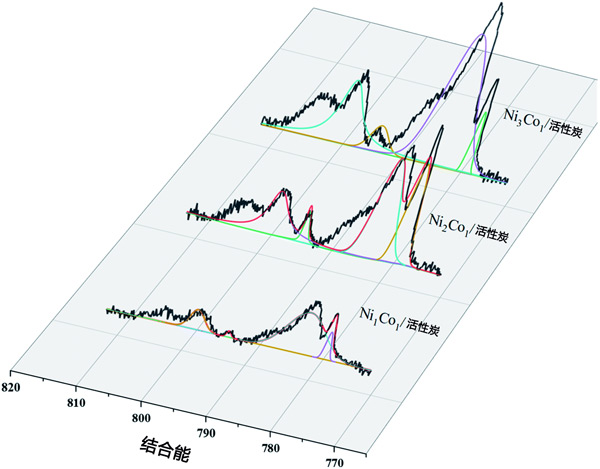 采用X射線光電子能譜(XPS)對(duì)多種活性炭催化劑進(jìn)行表面分析,并對(duì)鎳和鈷進(jìn)行表征氧化態(tài)。Ni02p光譜表現(xiàn)出兩個(gè)貢獻(xiàn),2p1/2和2p3/2(由自旋軌道分裂產(chǎn)生),分別位于870eV和852.4eV(圖1a-d),可以分配給存在金屬鎳。O1s峰和Ni2+的存在,這可以通過在873.8eV(Ni2+2p1/2)和852.8eV(Ni2+2p3/2)的主峰上觀察到的肩峰來證明,表明樣品在暴露于大氣層。類似地,催化劑中Co2p的XPS光譜(圖2)顯示出四個(gè)主峰,結(jié)合能分別為778.45eV、782.7eV、793.66eV和798eV,對(duì)應(yīng)于Co02p3/2、Co2+2p3/2,Co02p1/2和Co2+2p1/2。此外,根據(jù)載鎳活性炭,已觀察到載鎳鈷活性炭的結(jié)合能偏移隨著鈷負(fù)載量的增加而增加,最大偏移約為0.3eV。在比較這些樣品時(shí),從載鎳活性炭到載鎳鈷活性炭向更高結(jié)合能的轉(zhuǎn)變提供了鎳、鈷和載體物質(zhì)之間相互作用的證據(jù)。