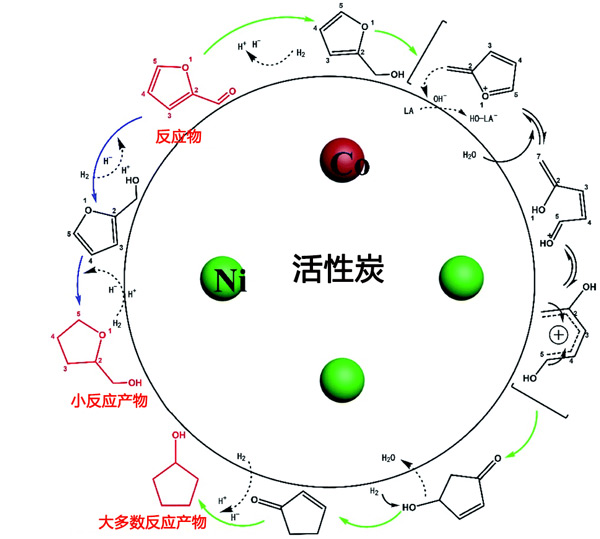 圖3:活性炭載鎳鈷催化劑上糠醛加氫的反應(yīng)過程。