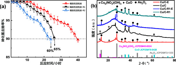 銅改性活性炭通過水洗和吹掃氣體法進(jìn)行再生。為此,活性炭樣品首先在100℃的熱空氣中活化3小時(shí)。然后用去離子水浸泡清洗4-5次,放入電熱風(fēng)烘箱中110-120℃烘干。之后,將樣品置于氮?dú)鈿夥障碌墓苁綘t中,并使用程序升溫控制器升高溫度。考慮到通過在180℃下烘烤獲得的材料,溫度首先設(shè)定在20-180℃。之后,停止加熱,將樣品冷卻至室溫。取出樣品,停止氮?dú)饬,?duì)再生材料進(jìn)行測(cè)試。如圖3a所示,R的再生效率(R為再生吸附劑與新鮮吸附劑的穿透時(shí)間之比)在一個(gè)再生循環(huán)后為65%。在第二次再生循環(huán)后,樣品恢復(fù)效率R達(dá)到60%,證實(shí)了活性炭吸附劑對(duì)去除AsH3具有合理的再生能力。為了確定活性炭吸附劑再生后表面相的變化,通過XRD分析活性炭吸附劑。如圖3b所示,再生后活性炭-R1中35.6°、38.8°和61.8°的CuO衍射峰強(qiáng)度明顯增加,但沒有Cu2(NO3)峰被找到。這表明在再生過程中回收的一些CuO物種可能被中間體Cu2(NO3)(OH)3轉(zhuǎn)化。此外,活性炭-R1樣品中As2O3在28.0°、32.2°、35.5°、42.6°、46.4°、55.0°和59.6°處的結(jié)晶峰明顯減弱。推測(cè)中間體Cu2(NO3)(OH)3向吸附活性中心CuO的轉(zhuǎn)變和結(jié)晶As2O3的分離可能是活性炭吸附劑再生性能好的原因。