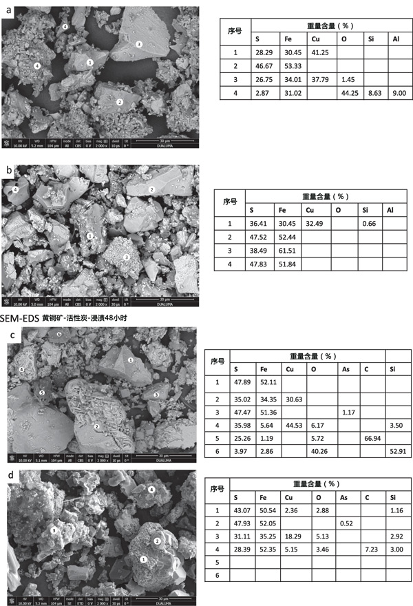 在浸出殘?jiān)邪l(fā)現(xiàn)的其他礦物種類是黃銅礦、黃鐵礦、閃鋅礦和石英。氧化還原電位必須足夠低才能形成Cu2S,而黃鉀鐵礬沉淀在非常高的氧化還原電位下更受青睞。通過SEM-EDS對初始活性炭樣品(圖3a)和浸出殘留物(圖3b和3c)的分析表明存在黃銅礦、黃鐵礦和初始精礦中的小石英顆粒。浸出48小時(shí)后(圖3b),固體殘留物顯示存在黃銅礦,表面因浸出而改變黃鐵礦。對活性炭浸出48小時(shí)后獲得的殘留物的分析表明存在黃鐵礦、吸附硫的碳,并且一些黃銅礦顆粒發(fā)生了很大的變化,表明從黃銅礦中優(yōu)先浸出Fe而不是Cu。