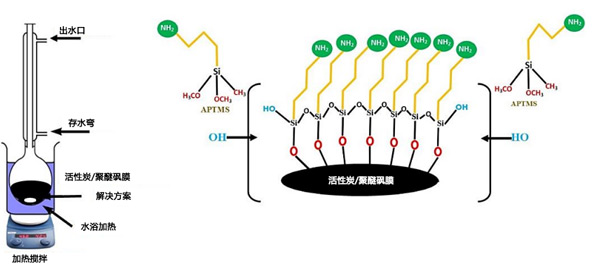 為了改性活性炭的表面,將15g非常細(xì)的干燥活性炭粉末與300mL甲苯和2mL氨丙基三甲氧基硅烷(APTMS)溶液在磁力攪拌下在40℃惰性環(huán)境下混合24小時(shí)。圖1表示實(shí)驗(yàn)裝置的示意圖。使用實(shí)驗(yàn)室旋轉(zhuǎn)蒸發(fā)儀去除溶劑。用甲苯和丙酮進(jìn)一步洗滌所得的APTMS活性炭,然后在60℃下真空干燥6小時(shí)。這種干燥的活性炭被稱為改性活性炭,由表面上的胺官能團(tuán)組成。改性活性炭在干燥條件下儲(chǔ)存以用于后續(xù)的實(shí)驗(yàn)工作。