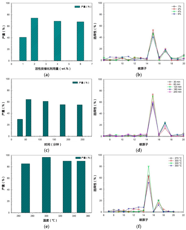 活性炭催化劑負(fù)載對烴類轉(zhuǎn)化和產(chǎn)物分化的影響如圖3a、b所示。脫氧反應(yīng)在惰性N2氣氛中在300℃的反應(yīng)溫度和500rpm的攪拌速度下進(jìn)行30分鐘。評估了催化劑負(fù)載量(即1-6wt.%)的影響。數(shù)據(jù)表明,脫氧性能和分化均在1-2wt.%的活性炭催化劑負(fù)載范圍內(nèi)升高,但隨后在催化劑負(fù)載>2wt.%后下降。產(chǎn)率和產(chǎn)物選擇性當(dāng)使用2wt.%時,其效果更好,即分別為47.13%和72.85%。相反,在催化劑負(fù)載量超過2wt.%時,脫氧性能和選擇性的下降可能反映了催化劑的負(fù)載過重,由于不同的活性位點的剩余活性位點,這將促進(jìn)對二級和并行反應(yīng)的驅(qū)動。