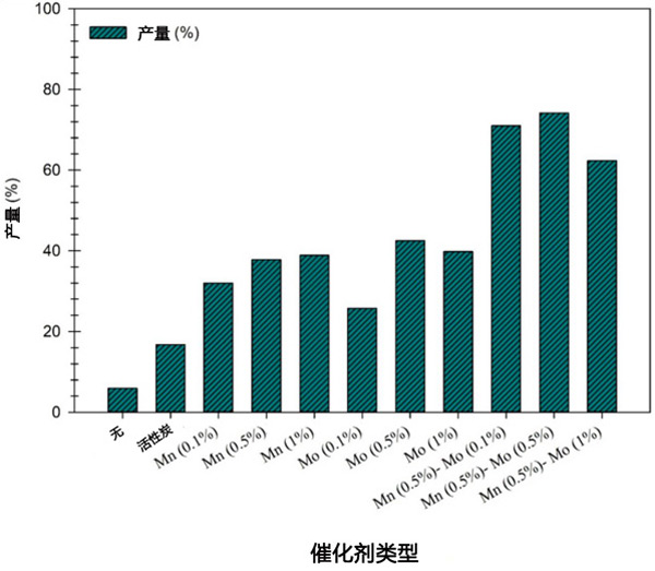 當(dāng)廢油對Mn/活性炭和Mn-Mo/活性炭催化劑樣品進(jìn)行脫氧反應(yīng)時,產(chǎn)物包括液態(tài)正烷烴和烯烴,以及含氧中間體物質(zhì),例如醇,醛和酮,以及汽化的CO和CO2。單獨或兩種活性炭金屬催化劑生產(chǎn)提供了優(yōu)異的轉(zhuǎn)化和完全差異化在廢油的溶解氧過程;钚蕴看呋瘎┑姆磻(yīng)性能主要取決于Mn和Mo表面密度以及催化劑的酸度。脫氧反應(yīng)在300℃的反應(yīng)溫度和500rpm的攪拌速度下在惰性N2中進(jìn)行30分鐘氣氛。對活性炭上Mn和Mo負(fù)載百分比的篩選表明,與0.1wt.%相比,將活性炭負(fù)載0.5wt.%將烴產(chǎn)率從31.9%提高到37.9%,并將Mo負(fù)載量從0.1wt.%提高至0.5wt.%導(dǎo)致產(chǎn)率從25.7%增加到42.4%。篩選結(jié)果表明,最佳的錳負(fù)載百分比為0.5wt.%,并選擇了此百分比。Mo對Mn催化劑的影響從0.1到1wt.%負(fù)載百分比進(jìn)行了研究,結(jié)果表明0.5wt.%的Mn和Mo是合適百分比,烴收率為74%(圖2)。