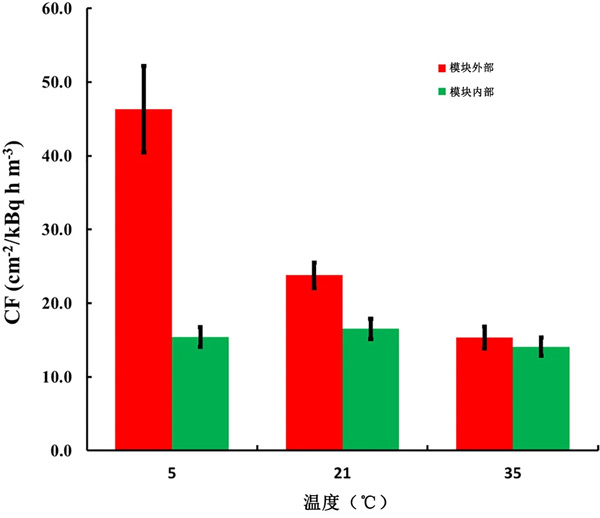 對于實驗,使用三種活性炭的織物為探測器設(shè)計了單獨的模塊。對于前兩種活性炭,模塊是HDPE,對于第三種活性炭,模塊是LDPE。單獨設(shè)計遵循上述方法,考慮到每種活性炭織物的確切單獨質(zhì)量。在所有設(shè)計中,不同溫度下的k(T)值根據(jù)方程式計算;钚蕴康慕Y(jié)果如圖2所示。5℃時的CF0比35℃時的CF0高305%。相比之下,對于放置在補(bǔ)償模塊中的傳感器,CF的變化在17%以內(nèi)(最大值/最小值=1.17)。值得注意的是,在模塊內(nèi)部不同溫度下暴露的傳感器的CF之間的配差異在95%的顯著性水平上沒有統(tǒng)計學(xué)意義。發(fā)現(xiàn)所描述的帶有補(bǔ)償模塊的探測器的CF明顯高于其他常用的無源氡探測器。
