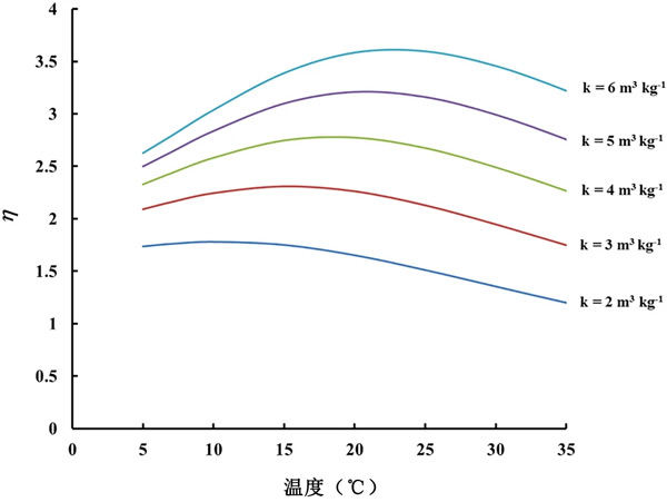 查看活性炭的檢測器的結(jié)果(圖2)可以看出,相同溫度下的CF0在活性炭之間存在差異。這意味著不同活性炭的吸附能力存在一些差異。在所有模塊設(shè)計中,假設(shè)21℃下的吸附容量值為4m3/kg-1。然而,由于我們的實驗結(jié)果表明不同活性炭材料的k可能存在差異。不同k值的結(jié)果如圖3所示?梢钥闯,對于區(qū)間2-6m3/kg-1內(nèi)的所有k值,η的變化(例如最大/最小比率)與溫度的變化遠(yuǎn)小于未包裝傳感器觀察到的230-305%的變化。