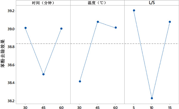 田口法用于優(yōu)化參數(shù),即時間、溫度和L/S,這些參數(shù)直接取決于苯酚的去除。選擇田口方法的選項越大越好。本研究的主要目的是活性炭從廢水中去除較多的苯酚,因此選擇了越大越好的選項。此外,采用添加劑模型來確定各個輸入?yún)?shù)對去除苯酚濃度的影響。這種分析稱為因子效應(yīng)的確定,結(jié)果見圖2。