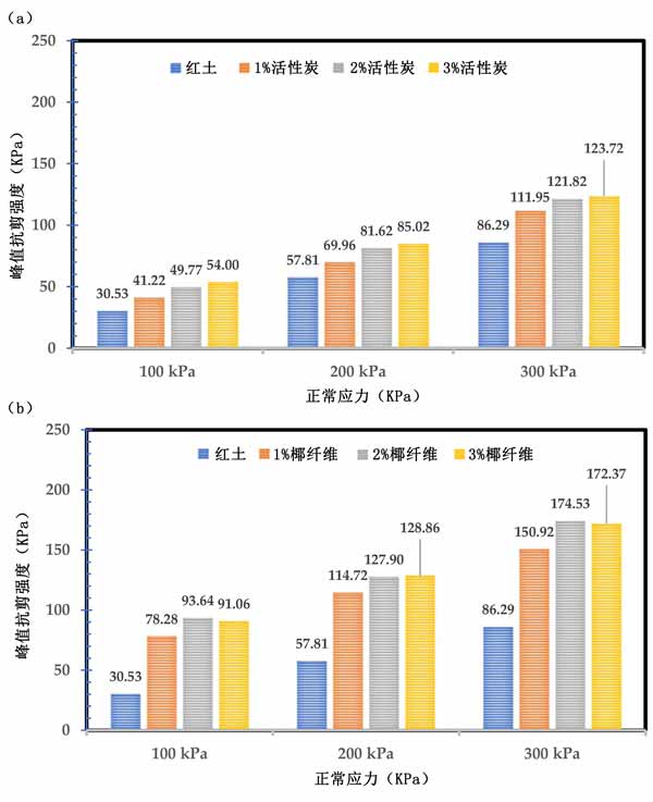 活性炭試樣的剪切強度與剪切應變的關系。峰值剪切強度隨著正應力的增加而提高,特別是300kPa正應力。此外,添加活性炭增加了峰值剪切強度,并且增強率隨著法向應力的增加而增加,如圖4a所示。同樣,添加0.5%的椰殼纖維進一步提高了活性炭穩(wěn)定土的峰值剪切強度,如圖4b所示。雖然在天然紅土中添加活性炭會增加峰值強度,但對于超過2%的活性炭,增加率并不顯著。例如,活性炭穩(wěn)定土的峰值強度分別為2%和3%活性炭的121.8kPa和123.72kPa?傮w而言,與本研究的結果相似。發(fā)現(xiàn)在石灰穩(wěn)定土壤中使用椰殼纖維可進一步提高抗拉強度和抗壓強度。還觀察到,椰殼纖維的加入提高了膨脹土中的兩個剪切參數(shù)。