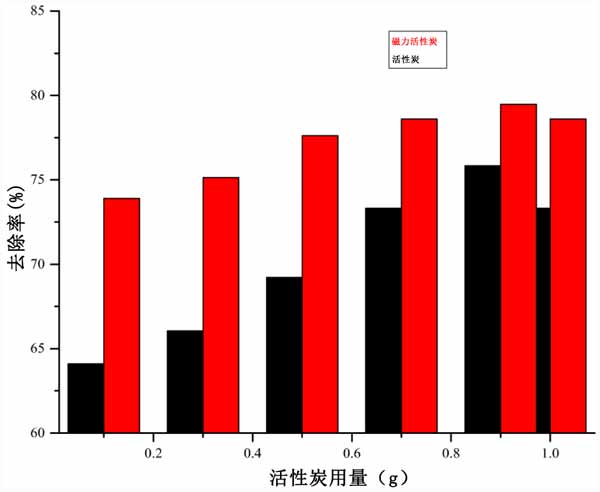 圖1:在接觸時(shí)間為100分鐘、初始BPA濃度為200mg/L、溫度為55℃時(shí),用量對(duì)活性炭和磁力活性炭吸附BPA的影響。