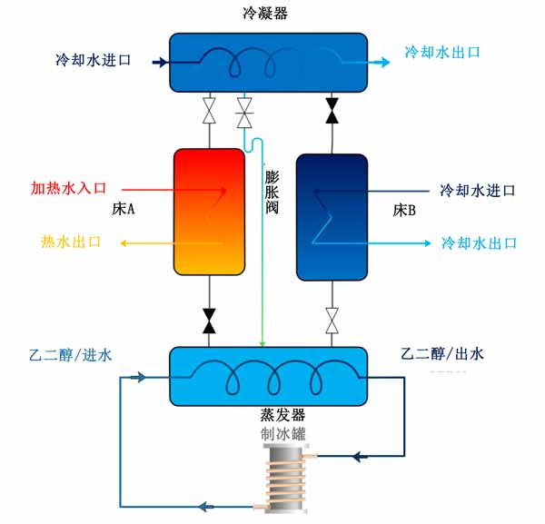 吸附制冰系統(tǒng)的兩床配置來檢查使用50%活性炭、10%聚乙烯醇和40%石墨烯納米片的復(fù)合吸附劑。制冰可以通過循環(huán)乙二醇來完成,乙二醇在-2℃下進入吸附制冷的蒸發(fā)器,并帶有外部制冰塊,如圖1所示。復(fù)合活性炭吸附劑應(yīng)用于吸附床中普通銅管的外表面上,加熱和冷卻流體被泵入管內(nèi)。加熱和冷卻水在四個過程(預(yù)熱、解吸、預(yù)冷和吸附)之間在兩個床之間切換,完成一個床循環(huán)。根據(jù)操作模式,切換閥用于將蒸發(fā)器和冷凝器與吸附床連接起來。