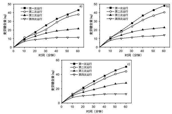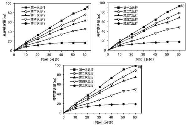 在間歇反應(yīng)器中檢測游離酶和固定化酶的水解活性。通過將可溶性淀粉溶解在蒸餾水中制備%淀粉溶液,并通過0.1M/HCl將pH值調(diào)節(jié)至4.7。然后將1g含有α-淀粉酶的活性炭纖維置于測試小瓶中。隨后,加入100cm3的淀粉溶液,并將系統(tǒng)在40℃下不斷搖動的水浴中孵育。每10分鐘抽取1cm3溶液以確定水解麥芽糖的量。通過加入1cm3的3,5-二硝基水楊酸試劑終止反應(yīng)。還在沸水浴中孵育5分鐘。還原糖(麥芽糖)的量通過分光光度法在540nm處測定。