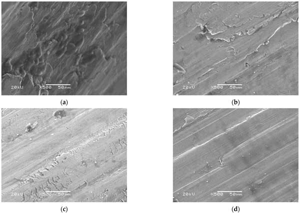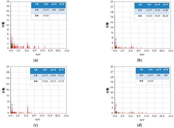 通過觀察摩擦學(xué)測試的結(jié)果,很明顯平均磨痕直徑和質(zhì)量損失的減少結(jié)果具有相似的趨勢。然而,當(dāng)將活性炭添加到潤滑脂中時,質(zhì)量損失值顯示出更陡峭的趨勢。為了進(jìn)一步了解質(zhì)量損失結(jié)果以及表面的磨痕形貌,應(yīng)用了與能量色散X射線(EDX)系統(tǒng)集成的SEM。測試氣缸磨痕的EDX光譜是針對放大500倍的SEM圖像確定的,以便從磨痕的表面軌跡中獲得關(guān)于接觸表面上的摩擦膜的沉淀元素(碳和氧)的必要信息。圖3顯示了以500倍放大倍率成像時的磨損表面形態(tài)。在具有粗糙表面形態(tài)的商業(yè)油脂樣品的情況下,圖像描繪了淺槽和深槽(圖3a)。另一方面,活性炭樣品和2wt.%其他樣品的磨損表面(圖3b,c)顯示出淺槽,帶有少量深槽點和光滑的形貌,而在0.5wt.%活性炭+2wt.%其他樣品的混合樣品僅顯示出薄槽(圖3d)。