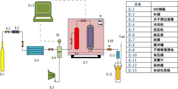 首先,來自儲罐的CO2通過標(biāo)稱尺寸為1µ的過濾器,以避免任何雜質(zhì)進(jìn)入工藝路徑。然后,CO2被引導(dǎo)至冰箱單元,其溫度降至-10℃和60bar。液化CO2使用往復(fù)泵加壓,并轉(zhuǎn)化為殼管式配置的調(diào)壓鼓。在這個(gè)鼓中,流體溫度被設(shè)置為適當(dāng)?shù)臏囟纫赃_(dá)到超臨界流體條件。該鼓的設(shè)計(jì)旨在減少波動,熱交換通過使用溫度精度設(shè)置為1K的1000W元件循環(huán)水進(jìn)行。壓力表安裝在調(diào)壓鼓的輸出端,以顯示出口流體壓力。之后,液體被引導(dǎo)到裝有10克活性炭和玻璃珠的萃取池。在提取單元的輸入和輸出處安裝了兩個(gè)孔隙率為1微米的過濾器,以防止顆粒逸出。細(xì)胞中玻璃珠的存在使CO2均勻分布在提取單元內(nèi)。在用SC-CO2加載萃取池后,將萃取池設(shè)置在適當(dāng)?shù)臏囟群蛪毫ο录s45分鐘。在靜態(tài)階段之后,動態(tài)階段從打開采樣閥開始。為了防止閥門凍結(jié),它被包裹在加熱元件中。在動態(tài)時(shí)間內(nèi),使用冰柜將樣品采集溫度保持在0℃以下。每個(gè)實(shí)驗(yàn)一式三份進(jìn)行,圖1顯示了超臨界流體裝置的詳細(xì)信息,通過將每個(gè)初始活性炭的溶質(zhì)重量除以計(jì)算超臨界回收率。