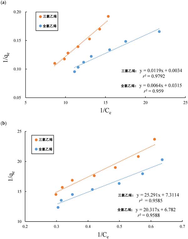 圖2:(a)活性炭和(b)硅膠吸附氯代有機(jī)化合物的實驗數(shù)據(jù),符合Langmuir等溫線的線性形式。