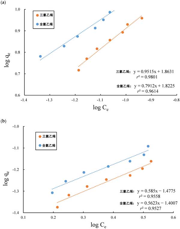 圖3:(a)活性炭和(b)硅膠吸附到氯代有機(jī)化合物上的實驗數(shù)據(jù),符合Freundlich等溫線的線性形式。