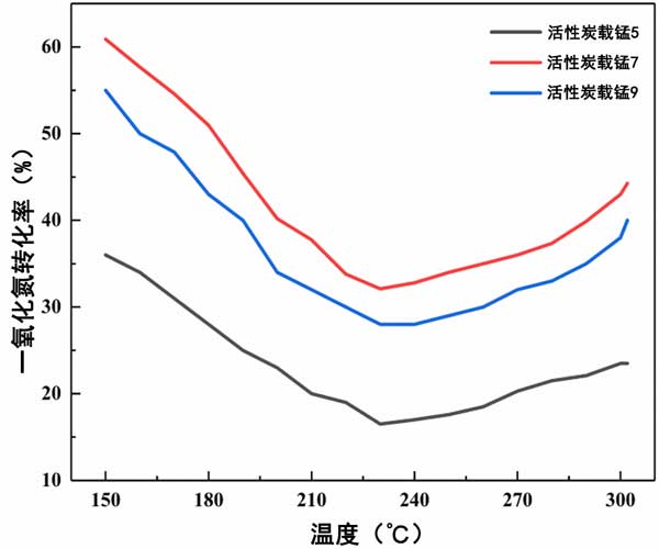 圖3:活性炭載錳催化劑的NO轉(zhuǎn)化率。