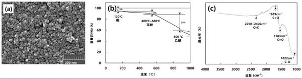圖1:(a)掃描電子顯微鏡(SEM)圖像,(b)TGA重量百分比曲線,以及(c)活性炭的光譜圖。