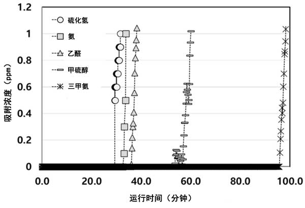 為了評估活性炭對不同廢氣的有效吸附量,應(yīng)研究其吸附能力。廢氣的氣味閾值和刺激水平在十億分之一的水平。吸附劑的總吸附容量很難用作從廢物中去除廢氣的設(shè)備的設(shè)計因素。因此,我們根據(jù)突破點計算了小于1ppm的有效吸附量。突破柱實驗在304不銹鋼管式反應(yīng)器中進行,總流量為1L/min,其中包含硫化氫(H2S)、氨(NH3)、乙醛(AA)、甲硫醇(MM)和三甲胺(TMA),如圖2所示。突破曲線依次為H2S、NH3、AA、MM、TMA。與廢氣相比,TMA具有更好的動態(tài)吸附性能,因為它具有更長的突破時間和相應(yīng)的更大的有效吸附容量(<1ppm)。