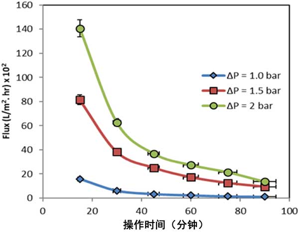 圖3:在不同的操作時(shí)間和壓力下滲透通量。