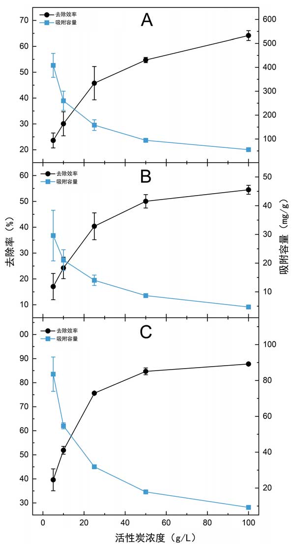 圖1:用幾種濃度的活性炭處理農用工業(yè)沼渣時,計算的COD(A)、PO4-P(B)和總酚(C)參數(shù)的吸附容量和去除效率。