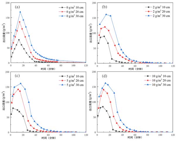 圖3:具有不同背景濃度的每個(gè)床出口的甲苯氣體出口濃度曲線。(a)0g/m3,(b)2g/m3,(c)5g/m3,(d)10g/m3。